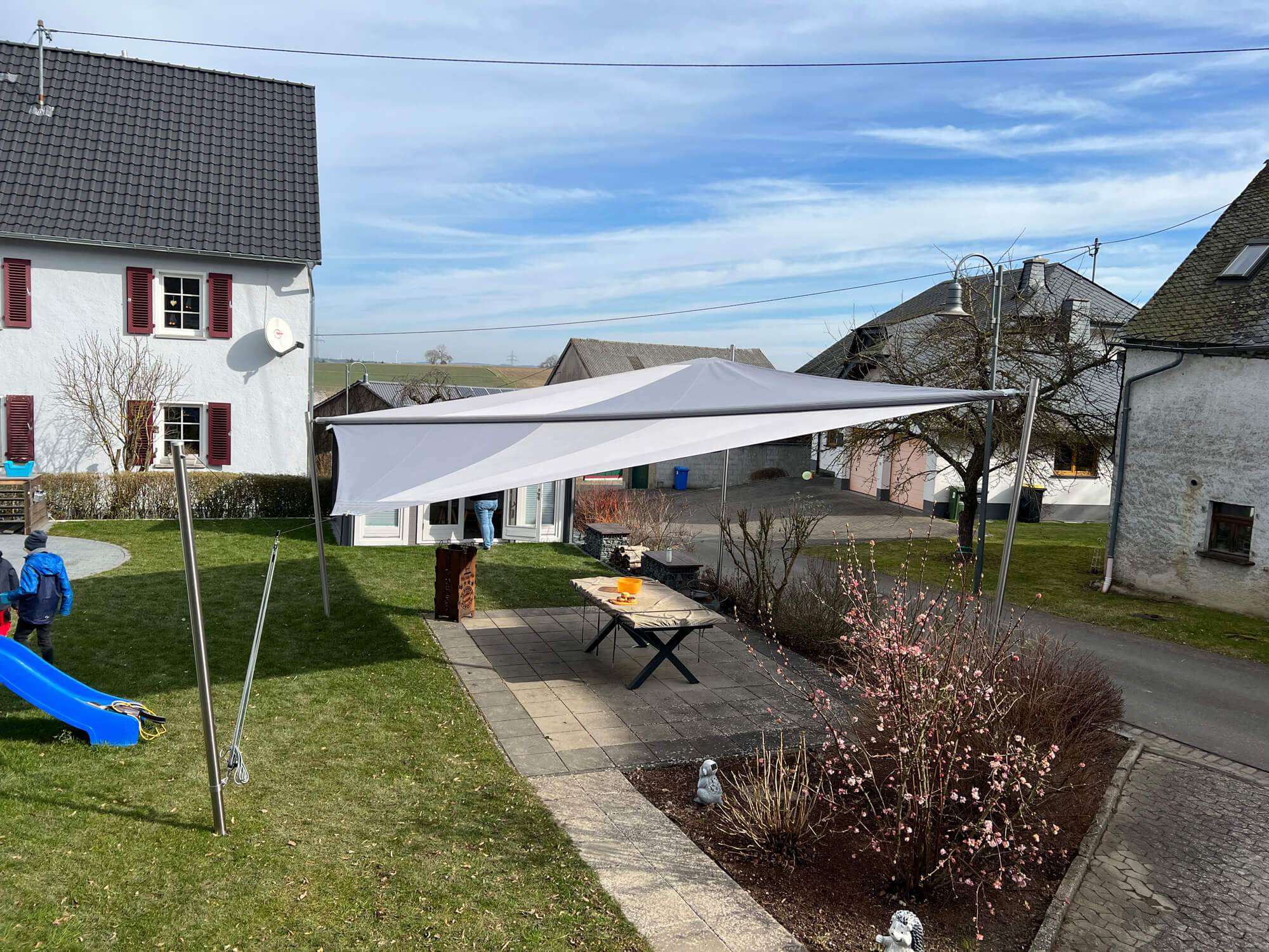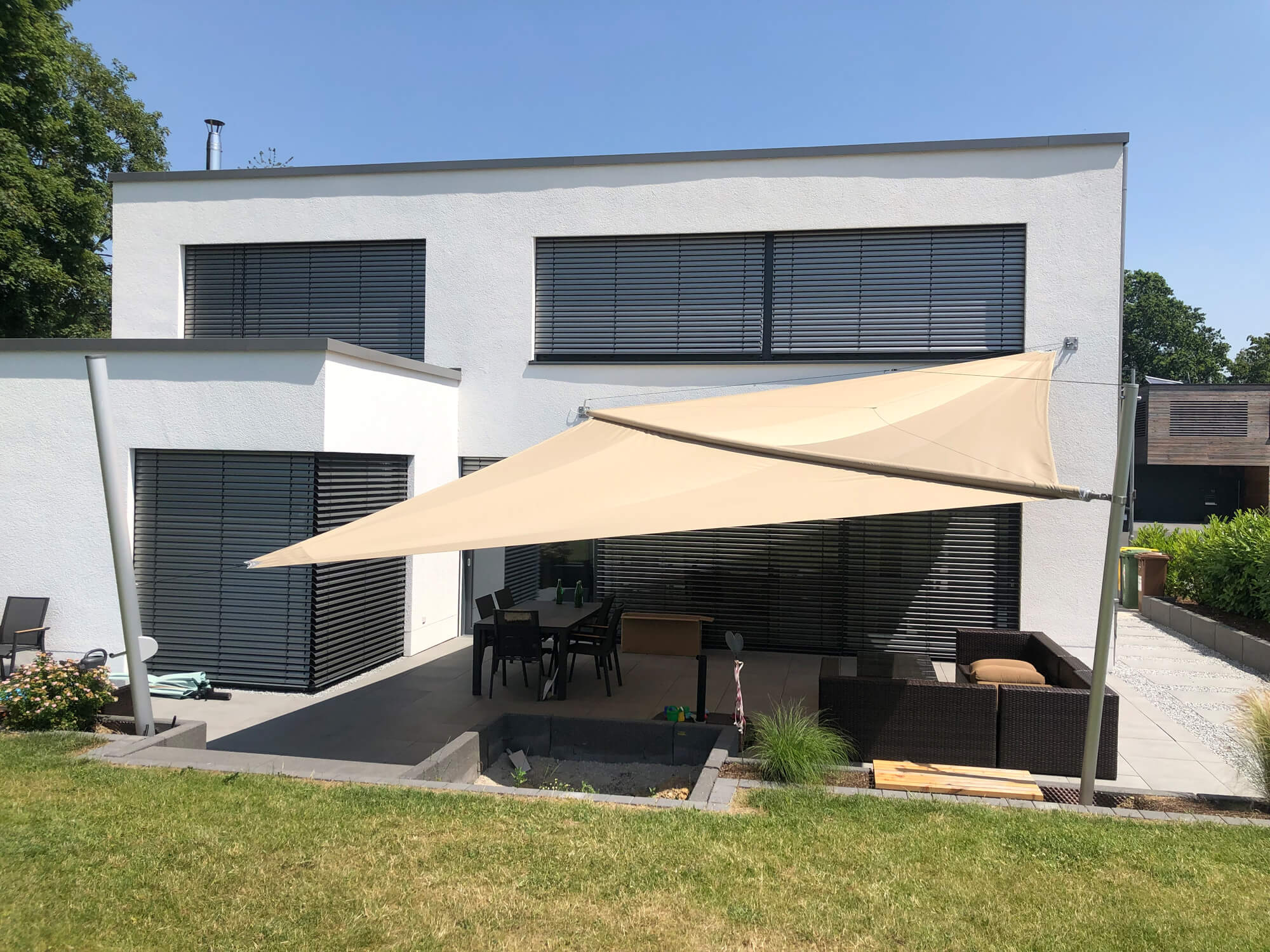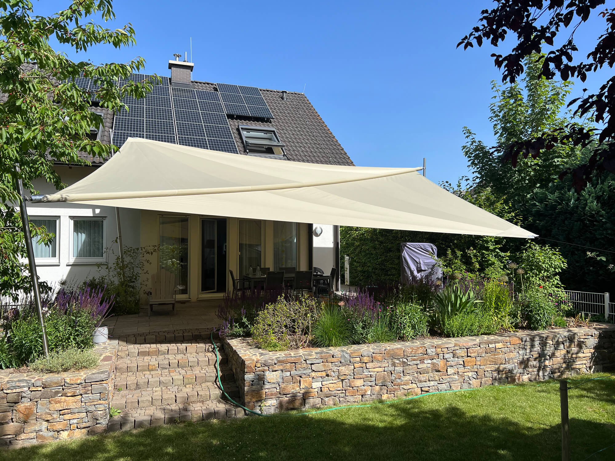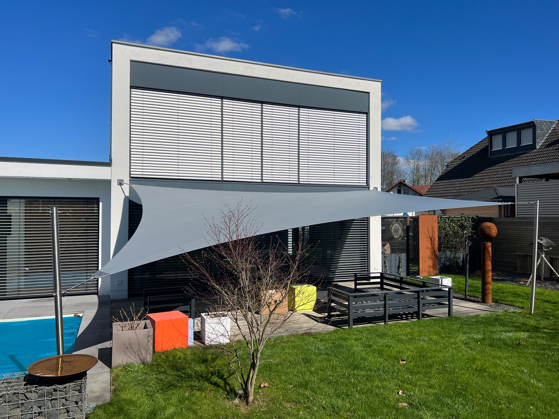 Neben aufrollbaren Sonnensegeln bieten wir Ihnen auch fest installierte Sonnensegel - für ein stilvolles und geschütztes Zuhause.